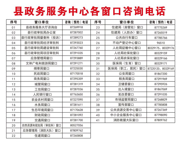 提倡线上办理、“不见面”审批。可网办事项原则上网上申报办理,申办材料可使用EMS快递服务(请咨询县政务服务中心各窗口,窗口预约咨询电话见下文)。