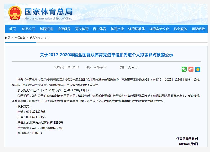根据《体育总局办公厅关于开展2017-2020年度全国群众体育先进单位和先进个人评选表彰工作的通知》(体群字〔2021〕111号)要求,经推荐审核,现将全国群众体育先进单位和先进个人拟表彰对象予以公示。