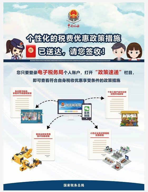 在此提醒广大纳税人缴费人,只要登录电子税务局个人账户,打开“政策速递”栏目,即可查看符合自身条件的税费优惠政策措施。快把这个好消息告诉你身边的小伙伴吧。
