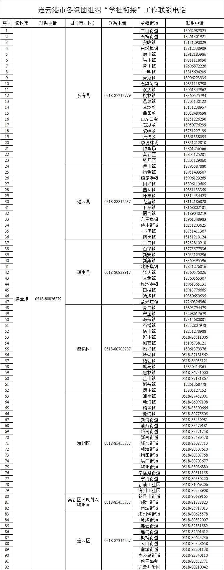 连云港市2021各级团组织工作联系电话汇总