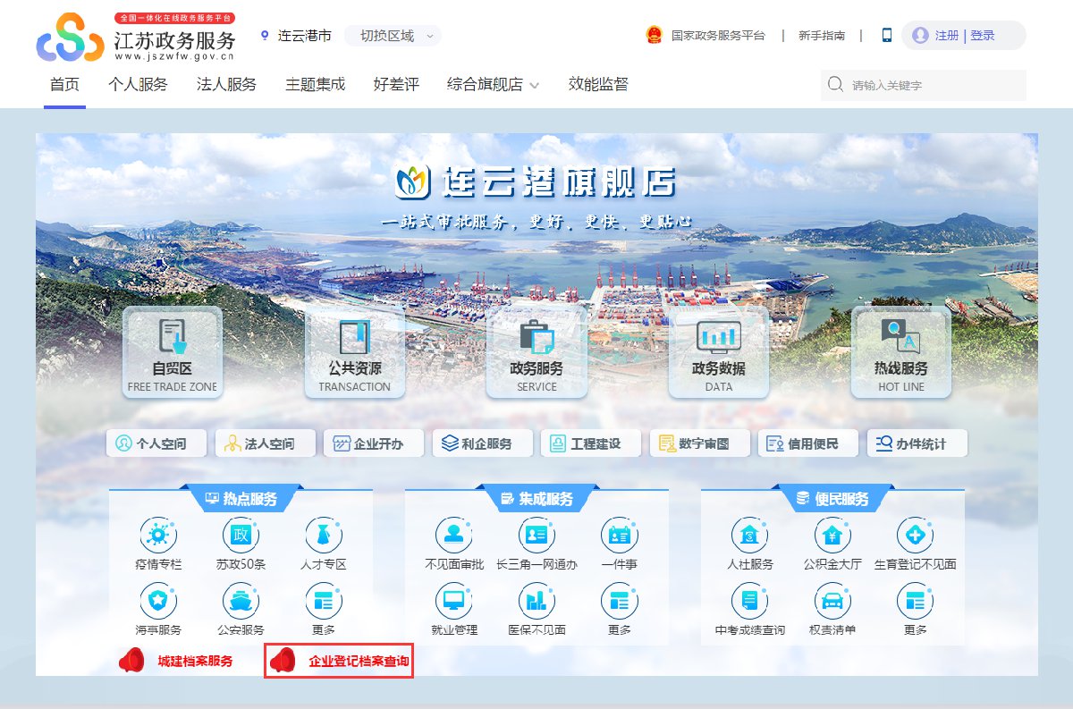 01、打开江苏政务服务网连云港旗舰店,点击“企业登记档案查询”。