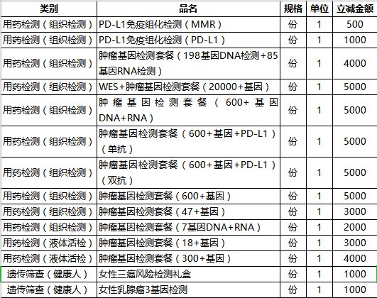 当被保险人使用指定基因检测服务时,可向被保险人提供最高立减5000元的优惠,详细可以看如下表格。
