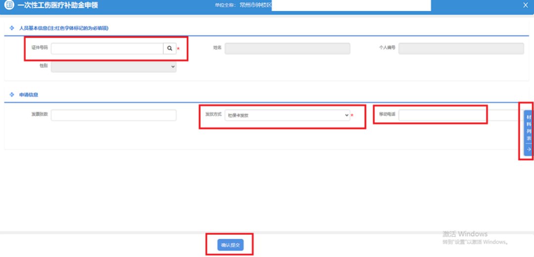 第三步:录入身份证号码后,选择一条对应的工伤认定信息,录入移动电话,点击【材料列表】上传《连云港市工伤保险待遇申请表》(单位盖章)后,点击【确认提交】。