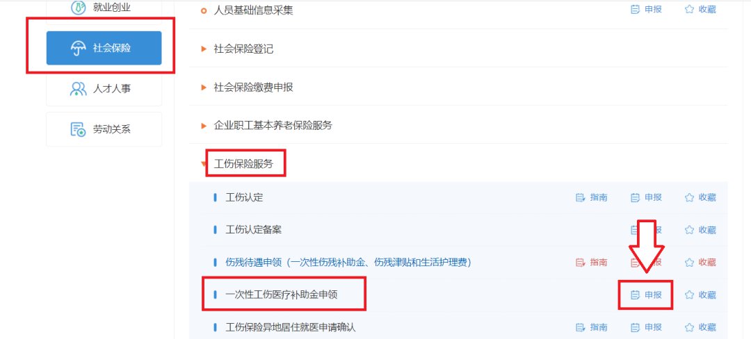 第二步:点击【工伤保险服务】,选择【一次性工伤医疗补助金申领】,点击【申报】。
