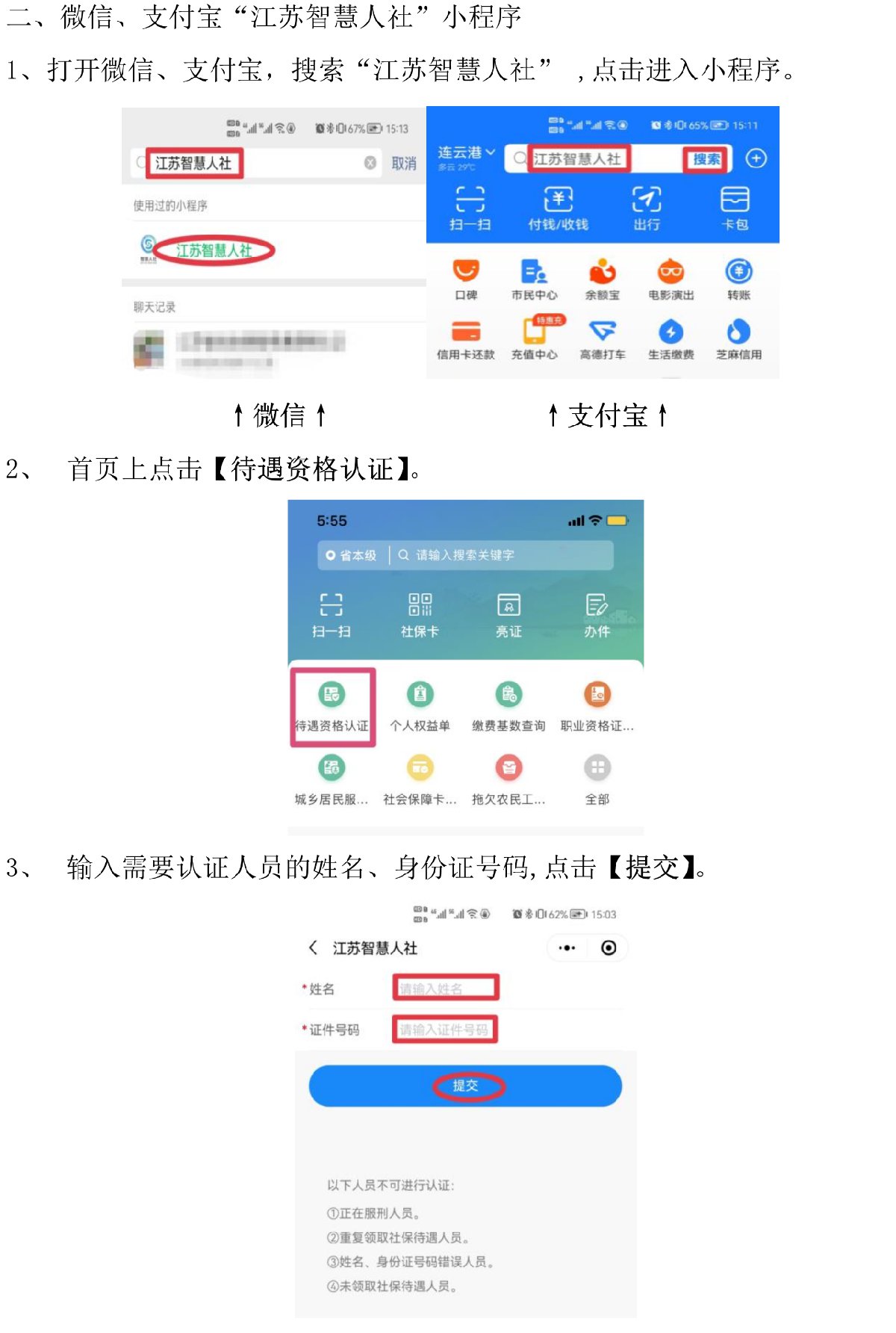 目前,江苏省人社一体化信息平台在连云港市上线运行。您可以通过“江苏智慧人社”APP,或通过微信、支付宝搜索“江苏智慧人社”小程序进行线上认证。操作步骤具体如下: