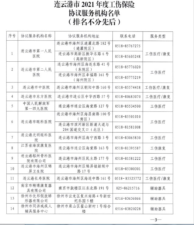 根据《工伤保险条例》、《关 于加强工伤保险医疗服务协议管理工作的通知》、《江苏省实施〈工伤保险条例>办法》、《江苏省工伤康复协议医疗机构条件(试行)》、《连云港市工伤康复定点医疗机构协议管理办法(试行)》等文件规定,现新增连云港长寿医院为我市2021年度工伤保险医疗、康复协议服务机构,协议执行时间为2021年1月1日至2021年12月31日。