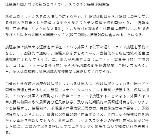江苏省启动外籍人士新冠疫苗预约接种(中英日韩语)