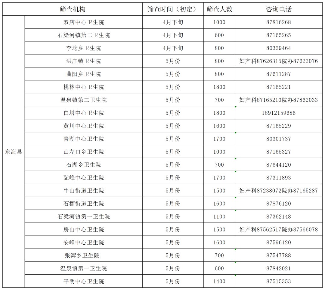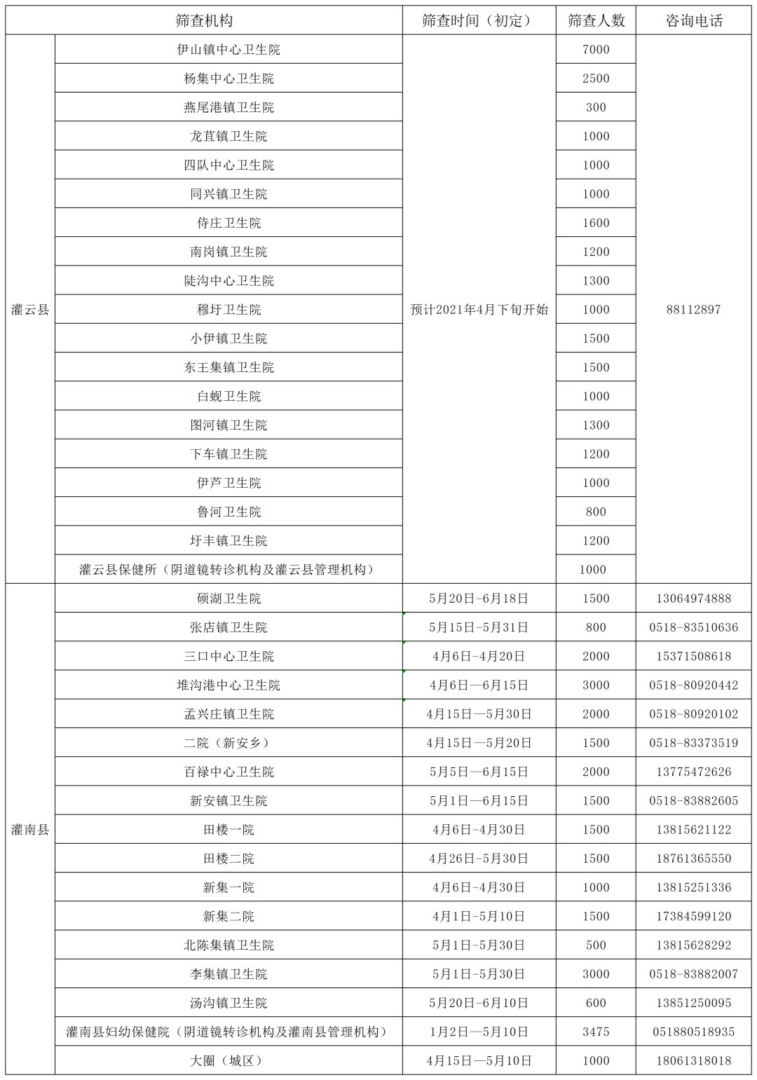 2021年连云港市定点初筛机构+筛查人数+预计开始时间+咨询电话