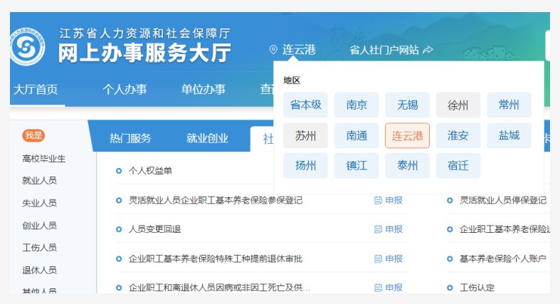 打开江苏省人社厅网上办事服务大厅(网址:https://rs.jshrss.jiangsu.gov.cn/index/)选择“连云港”即可办理以下业务了。
