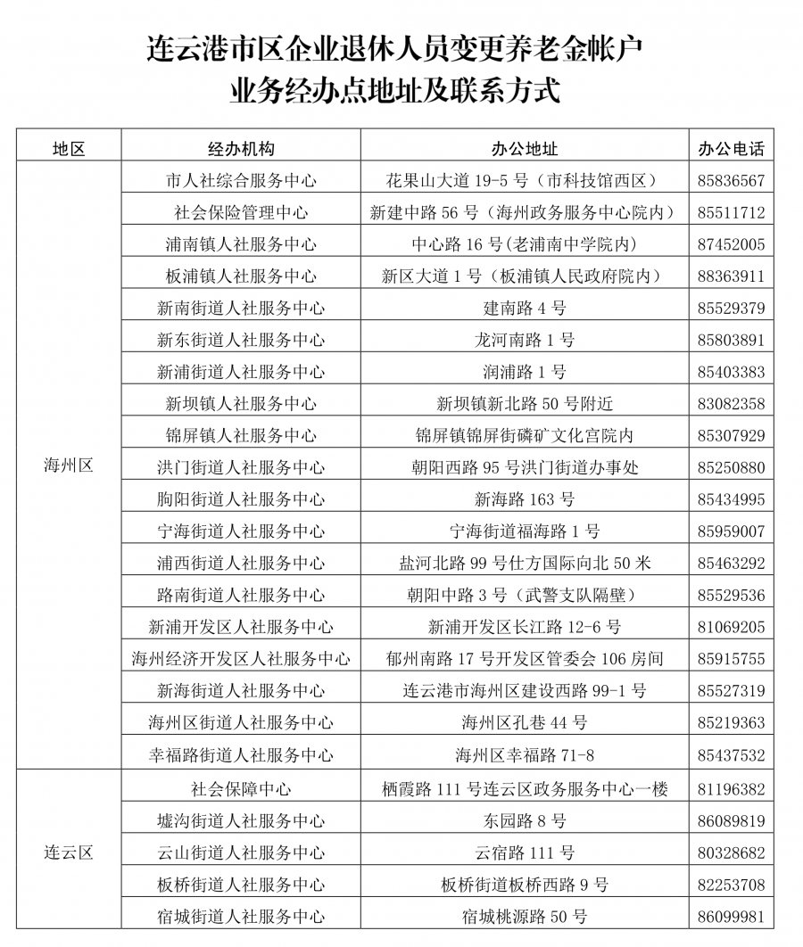 连云港市区企业退休人员变更养老金经办地点+电话