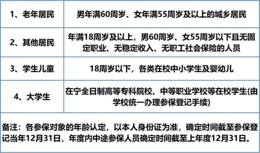 老年居民:男年满60周岁、女年满55周岁以上的城乡居民;