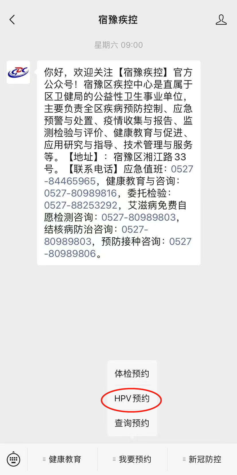 一、打开微信,搜索并关注微信公众号“宿豫疾控”。