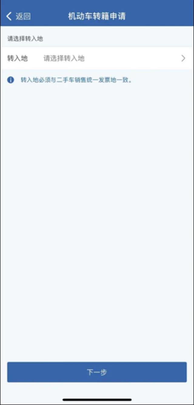 对二手车在转入地交易的,现机动车所有人可以通过公安交通管理互联网服务平台向转入地车辆管理所提出申请车辆跨辖区转移登记。申请前,应当认真阅读“业务须知”,确认机动车是否符合转入地相关规定,按照提示录入申请信息。转入地车辆管理所在受理网上申请后,通知转出地车辆管理所制作并转递电子化机动车档案资料。机动车档案资料转递完成后,现机动车所有人将收到互联网服务平台到业务窗口办理转移登记的通知。