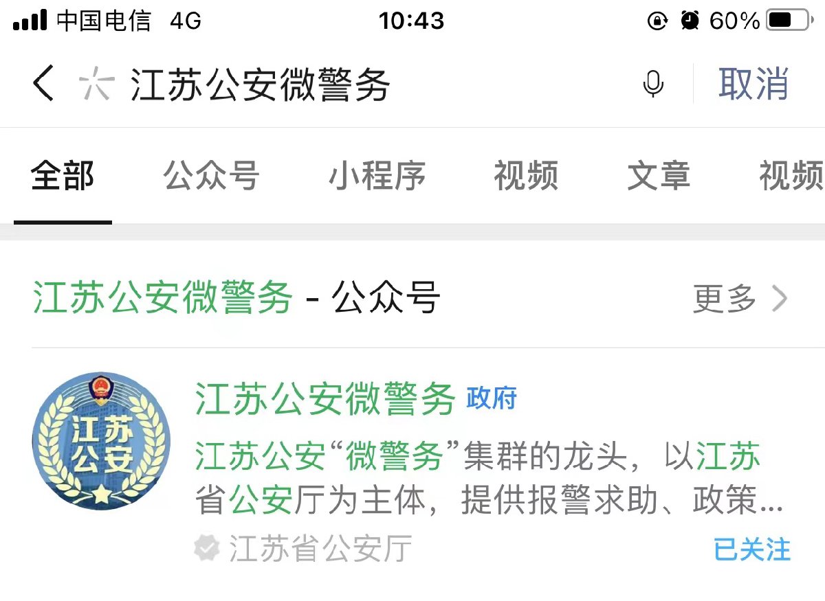 1.微信搜索并关注【江苏公安微警务】;