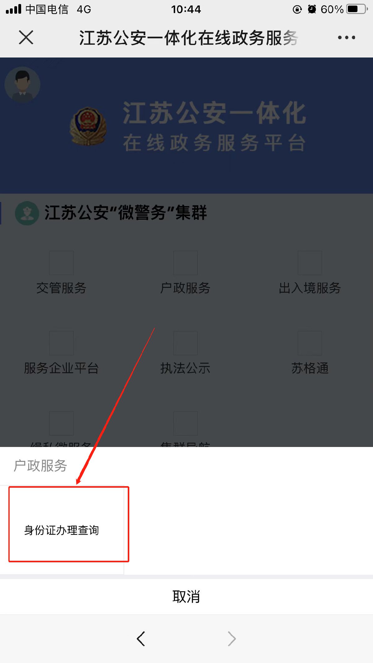 3.点击【户政服务】,然后选择【身份证办理进度】;