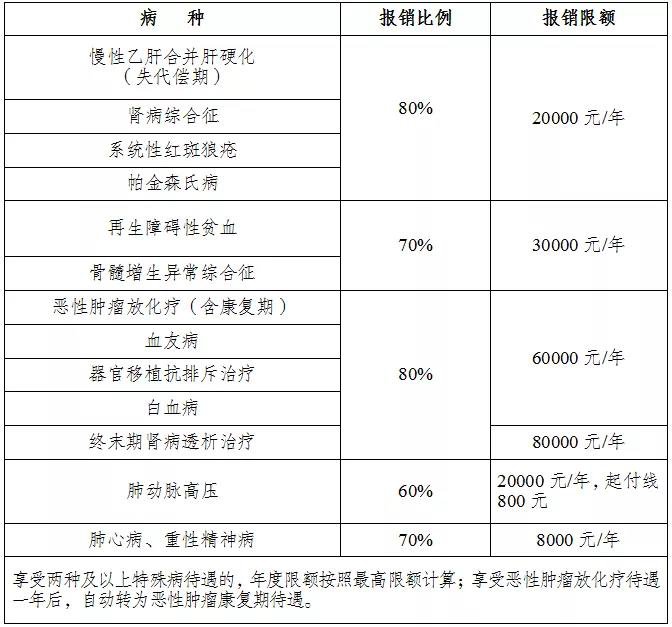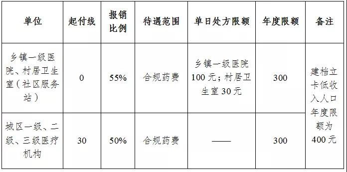 注:建档立卡低收入人口住院起付线减少10%、报销比例提高5个百分点、报销限额为35万;其中二级以上重度残疾人,各段住院报销比例在上述基础上再提高5个百分点。学龄前儿童及全日制在校学生不设报销限额。