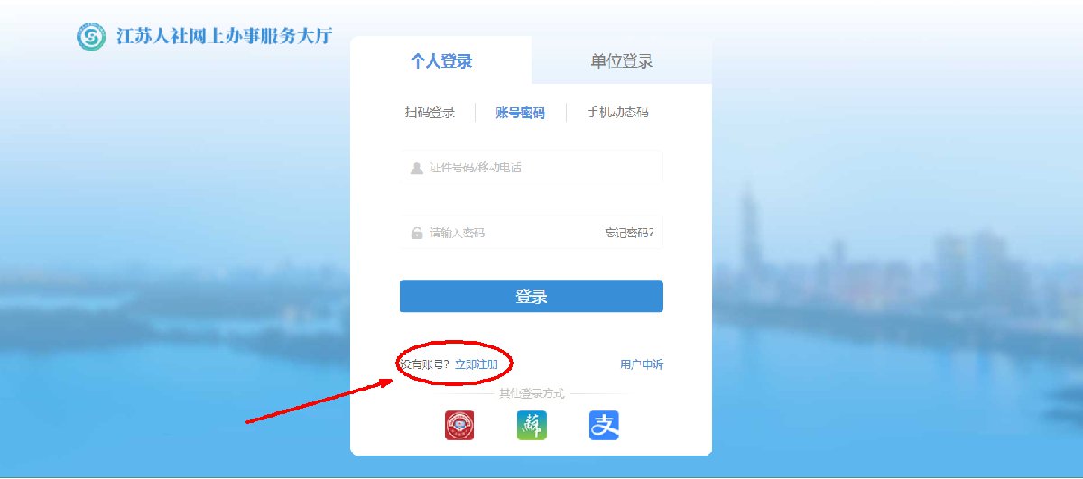 一、浏览器输入网上办事大厅网址,首次登录请注册。(https://rs.jshrss.jiangsu.gov.cn/index/)