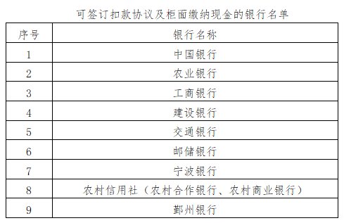 2.参保人选择委托银行扣款方式缴费的,原签订的委托银行扣款协议继续有效;新参保的或新增、变更扣款银行账户的,需签订委托银行扣款协议。协议签订可到缴费账户开户的9家银行各营业网点办理,也可通过“宁波税务”APP、宁波市电子税务局和已部署税务系统的城乡居民医保参保经办点办理。