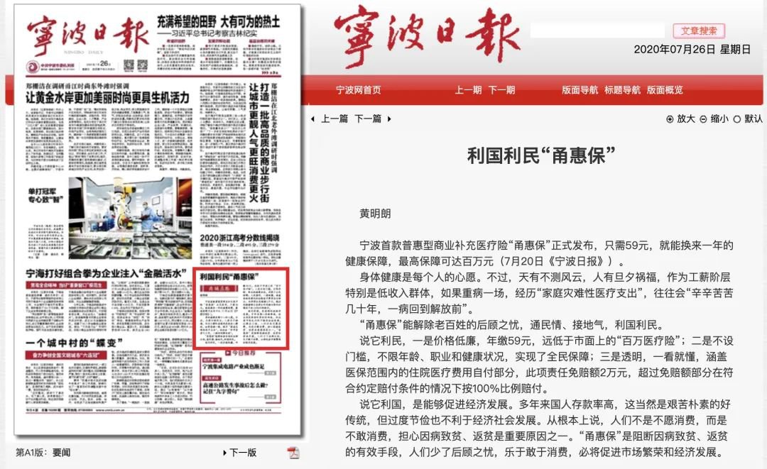 连宁波日报头版、慈溪日报也有ta大家都在给“甬惠保”打call通民情、接地气,利国利民!