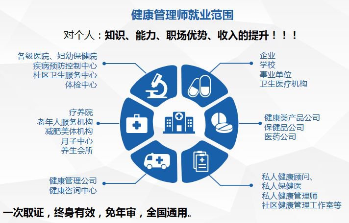 这一职业的就业前景可谓是非常不错,考证以后,就业方向也很广,包括以下这些行业及机构:健康管理公司、医院体检中心、健康咨询中心、基因公司、康体中心、健康养生会所、俱乐部等。私人健康顾问、保健医生、社区健康工作室等。