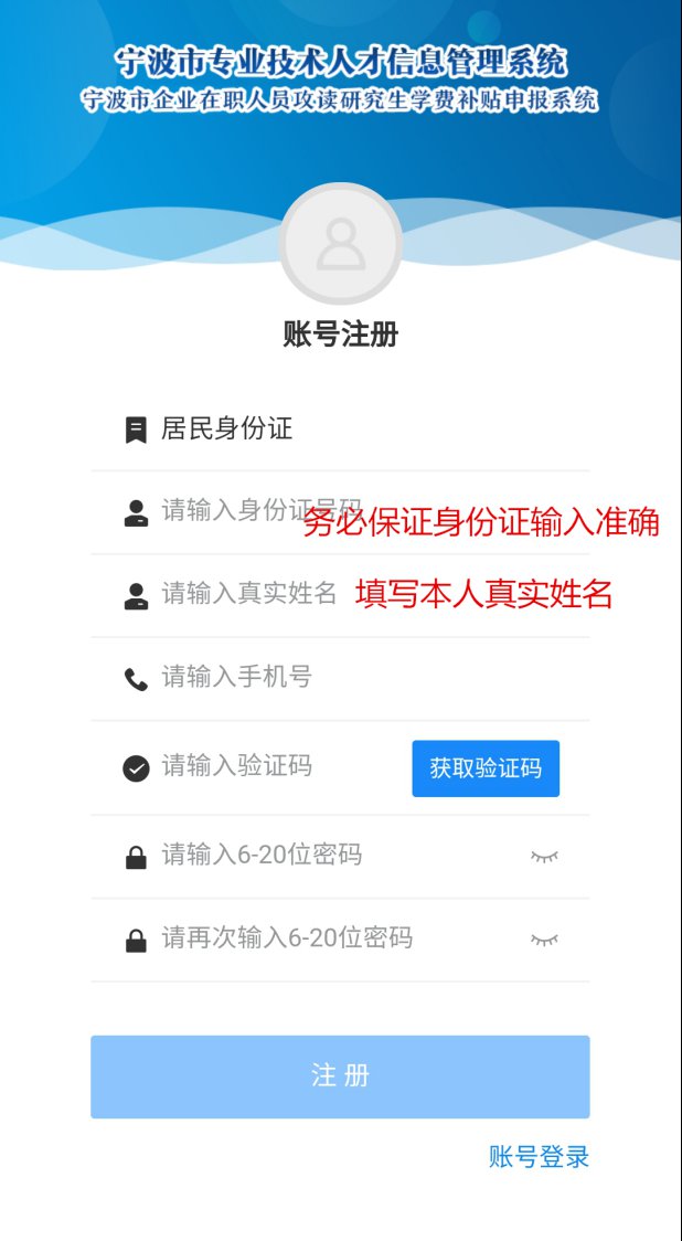 宁波市企业在职人员攻读研究生学费补贴统一实行在线申报。申报人应在规定的申报时间内(2021年10月31日24点前,如有变化以全国硕士研究生招生考试网上报名平台的网报截止时间为准)注册登录“宁波市企业在职人员攻读研究生学费补贴申报系统”(以下简称“申报系统”)进行申报。