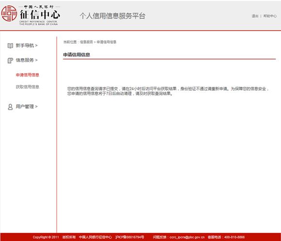 提交查询申请后的24小时后,用户登录平台,点击"信息服务"—"获取信用信息",输入平台发送到用户手机上的身份验证码,点击"提交"。