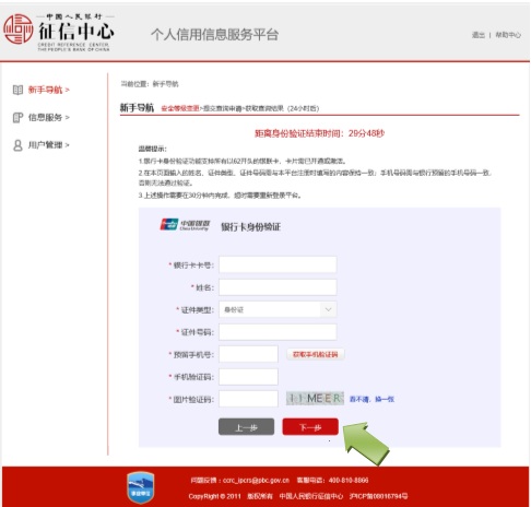 提交查询申请后的24小时后,用户登录平台,点击"信息服务"—"获取查询结果",输入平台发送到用户手机上的身份验证码,查看选择的信用信息产品。