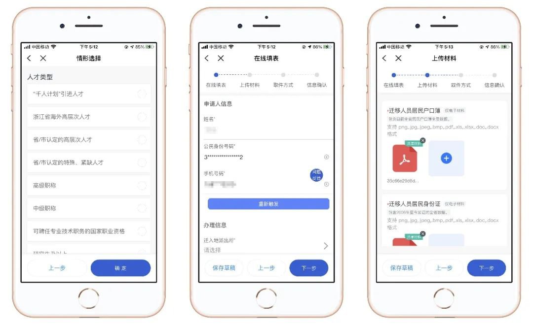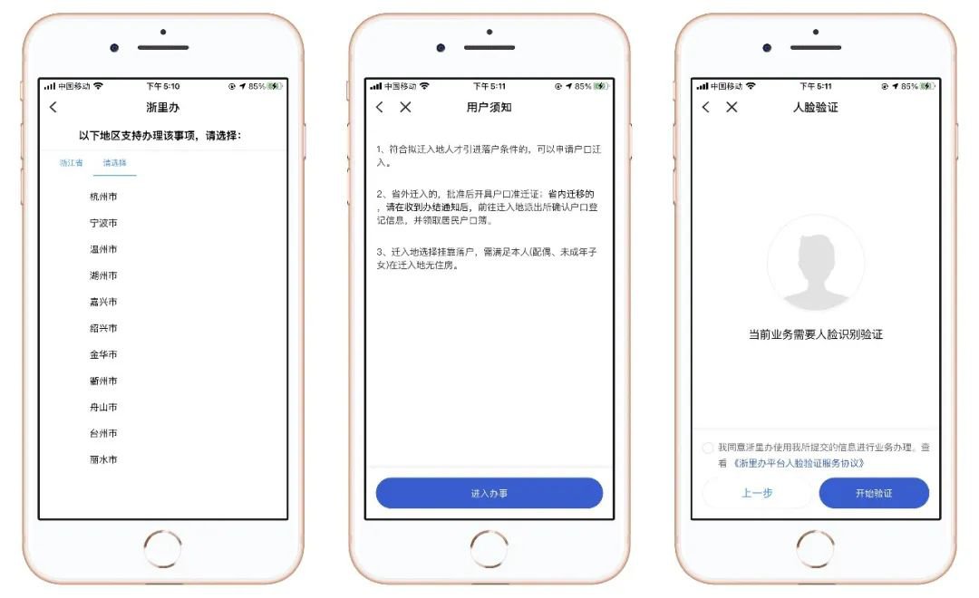 迁入浙江的申请人也可直接通过互联网申请办理。目前,“浙里办”APP支持的户口迁移办理事项主要有市外的夫妻投靠,未成年子女投靠,老年父母投靠,人才引进落户,合法稳定住所落户等。