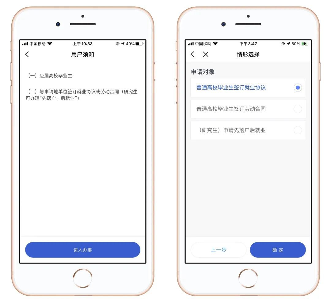 申请对象包含普通高校毕业生签订就业协议、普通高校毕业生签订劳动合同、(研究生)申请先落户后就业。
