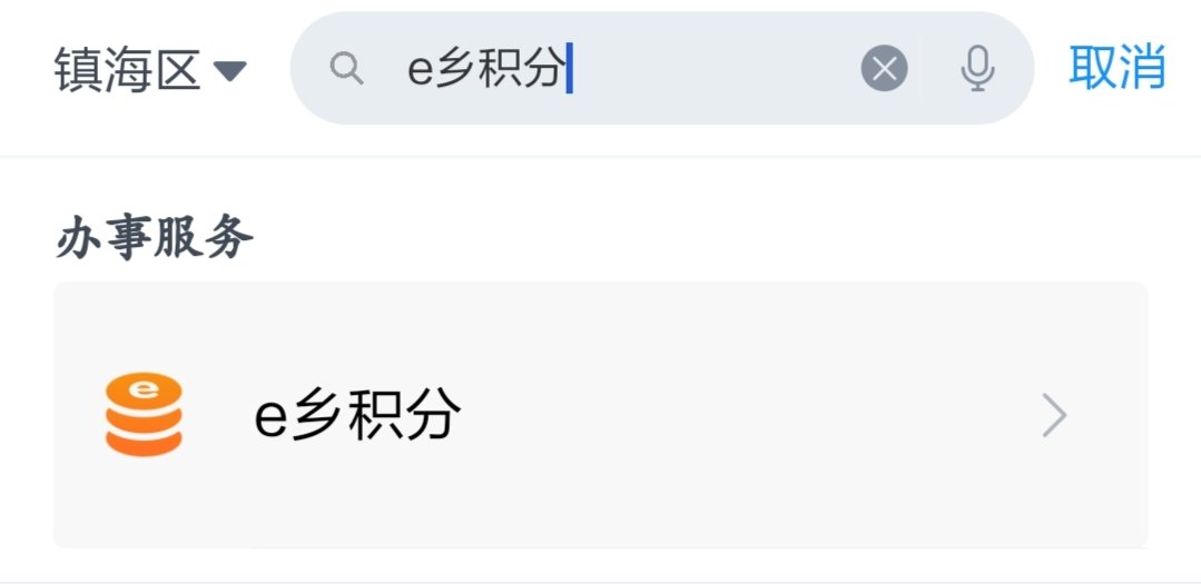 下载“浙里办”app后,请选择左上角区域“宁波,镇海区”—搜索“e乡积分”