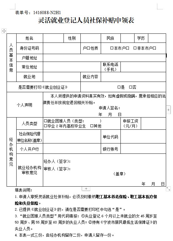 宁波灵活就业登记人员社保补贴申领表(附表格下载)