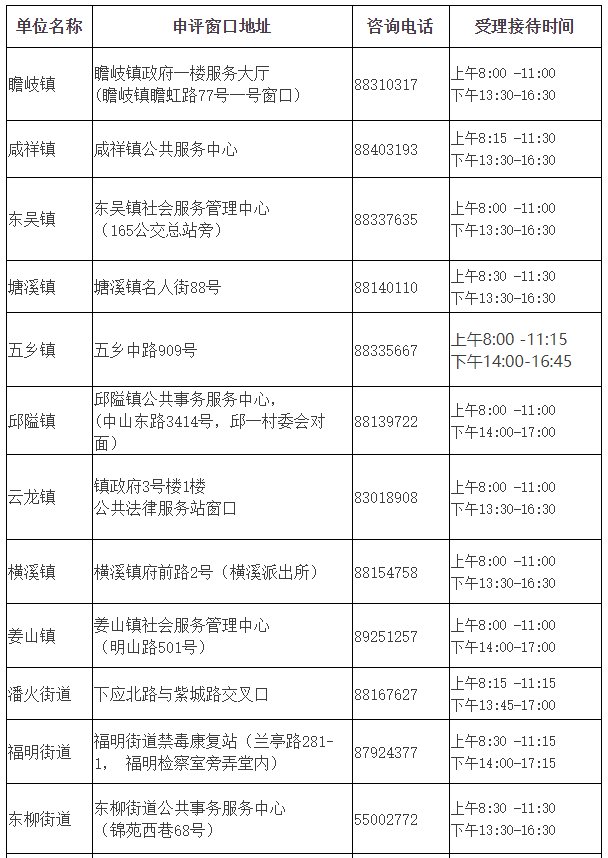 (一)各镇(街道)流动人口量化积分申评服务窗口基本信息