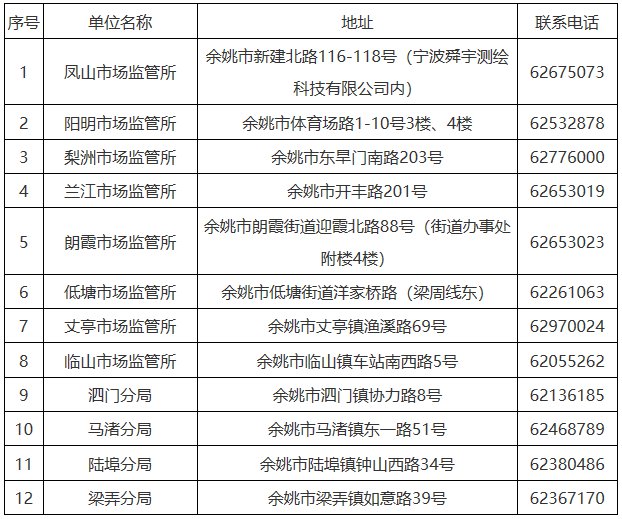 (一)余姚市市场监督管理局 地址:余姚市南雷南路301号 电话:62719971