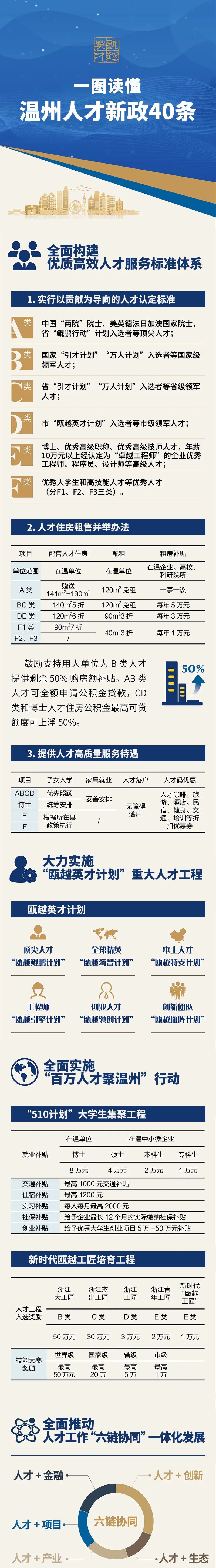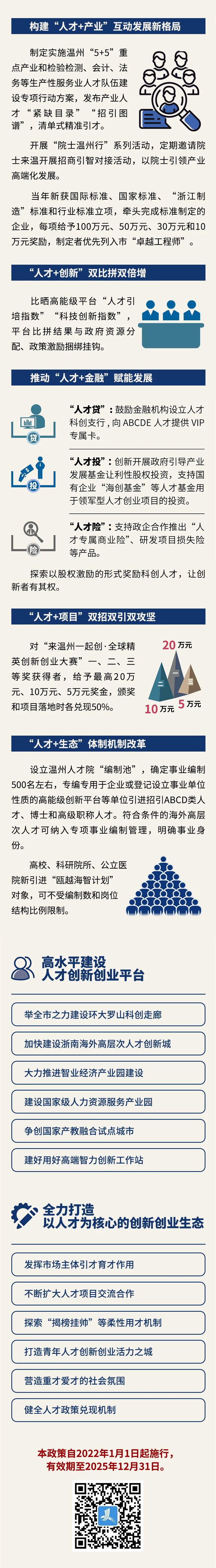 新出炉的《关于大力实施“瓯越英才计划” 高水平建设浙南重要人才中心和创新高地的40条意见》,是原有“人才新政40条”的再升级版。政策受惠面更广、“含金量”更高,从2022年1月1日开始施行。