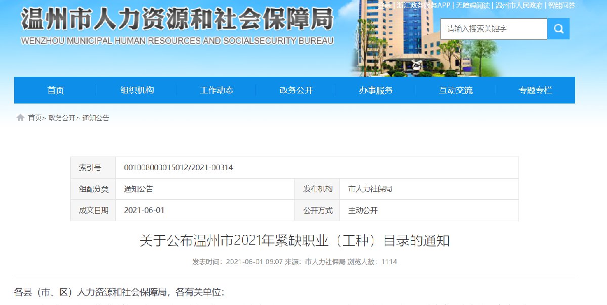 关于公布温州市2021年紧缺职业(工种)目录的通知