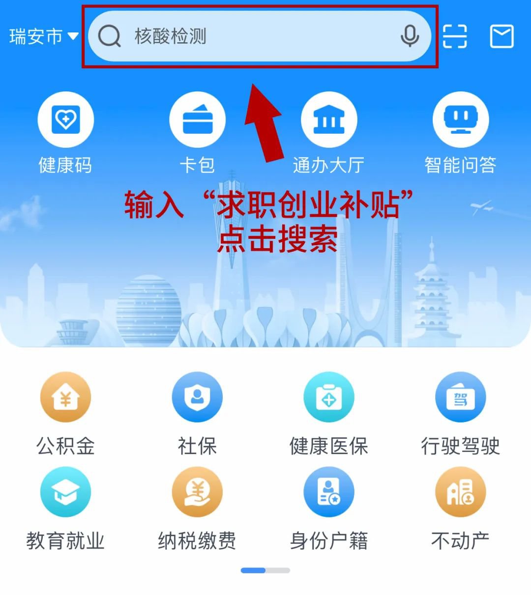 2.“浙里办”APP首页,搜索“求职创业补贴”。