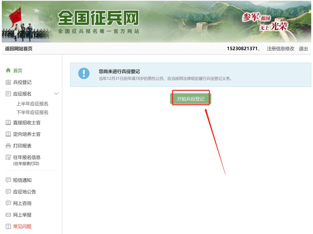 登录系统以后,如果你是男兵且未做兵役登记,则需要点击“开始兵役登记”进行兵役登记啦,如果你已经做过登记了就不会有这一步