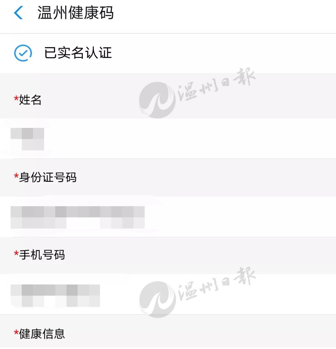 二、授权“温州健康码”获取个人有关信息(姓名、手机号、证件号码)等后,依次填写选项(*为必填)