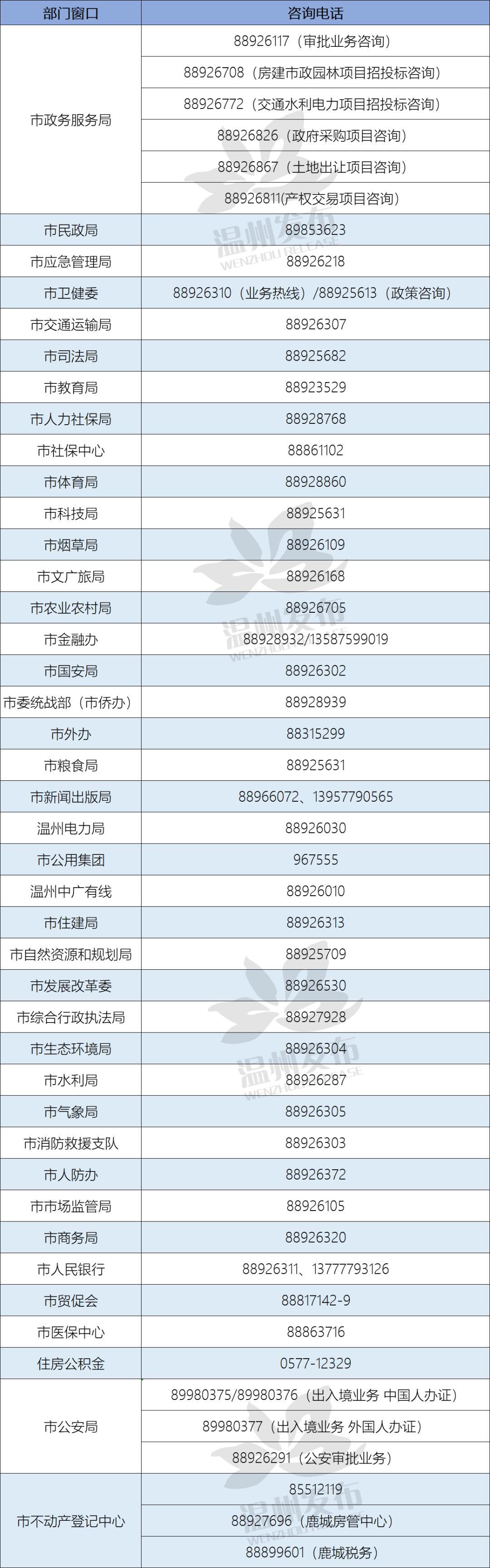 小编从市政务服务局获悉,即日起,有需要的小伙伴可以拨打市民中心各进驻部门电话进行业务咨询。另外,2月9日起,市民中心将接受急需业务线下办理预约。小编已经整理好现场办理预约电话表和业务咨询服务热线表啦,快来看看~温州市民中心各进驻部门(单位)咨询电话