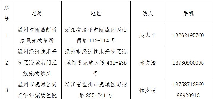 温州市洞头区犬只狂犬病免疫、芯片植入和准养登记工作定点单位名单