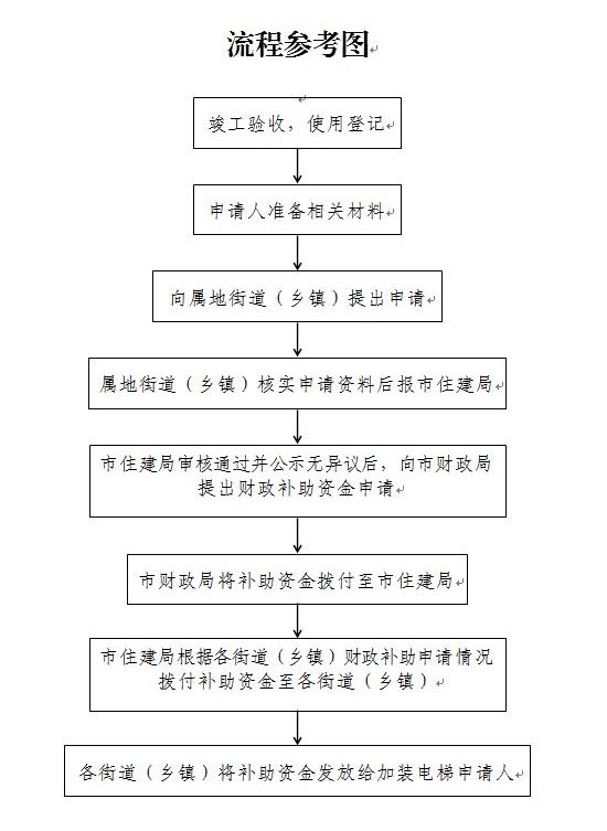 属地街道(镇)核实申请材料后于每年3月份、9月份分两批将汇总表报送至市住建局,提出财政补助资金申请。市住建局复核通过,并经社会公示无异议后,向市财政局提出财政补助资金申请。市财政局将补助资金拨付至市住建局,市住建局根据各街道(镇)财政补助申请情况将补助资金拨付至各街道(镇),各街道(镇)将补助资金发放给加装电梯申请人。