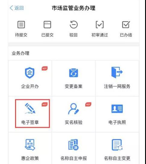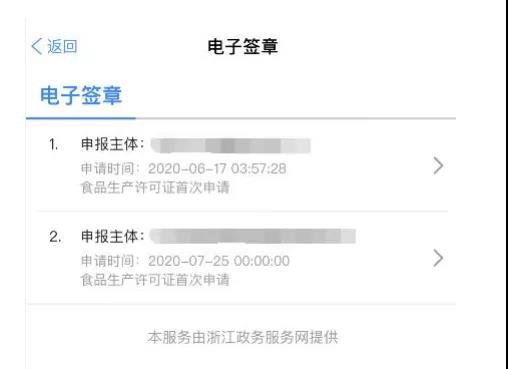 许可事项申请提交后,企业法定代表人(或负责人)可登录“浙里办”APP,搜索“市场监管业务办理”,点击“电子签章”模块,对系统生成的电子版申请材料进行电子签名,保证申请的真实性。