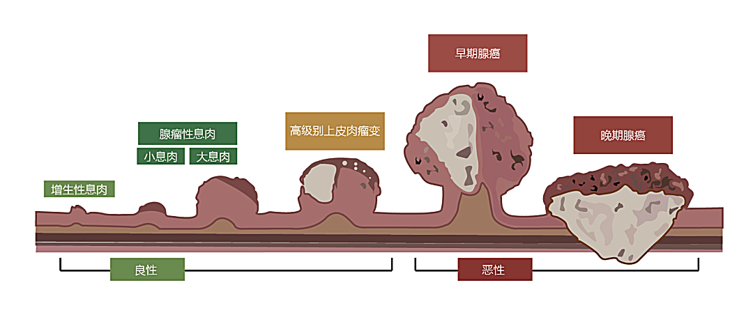 大多数结直肠癌始于息肉,息肉是结直肠内膜组织的过度生长,但并非所有息肉都是恶性的。
