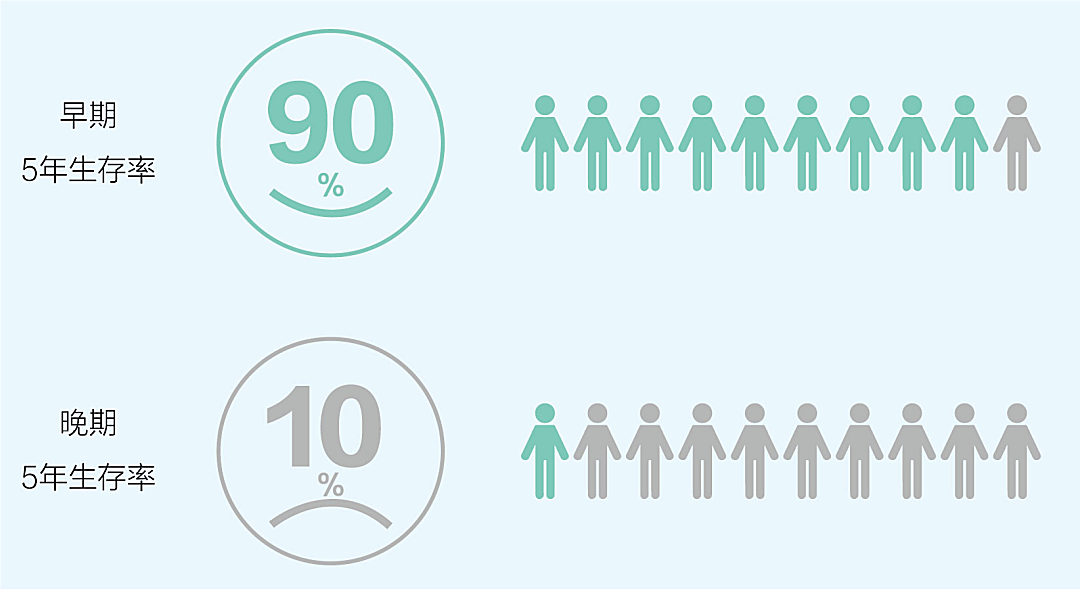 早期结直肠癌5年相对生存率超过90%,晚期生存率仅为10%。