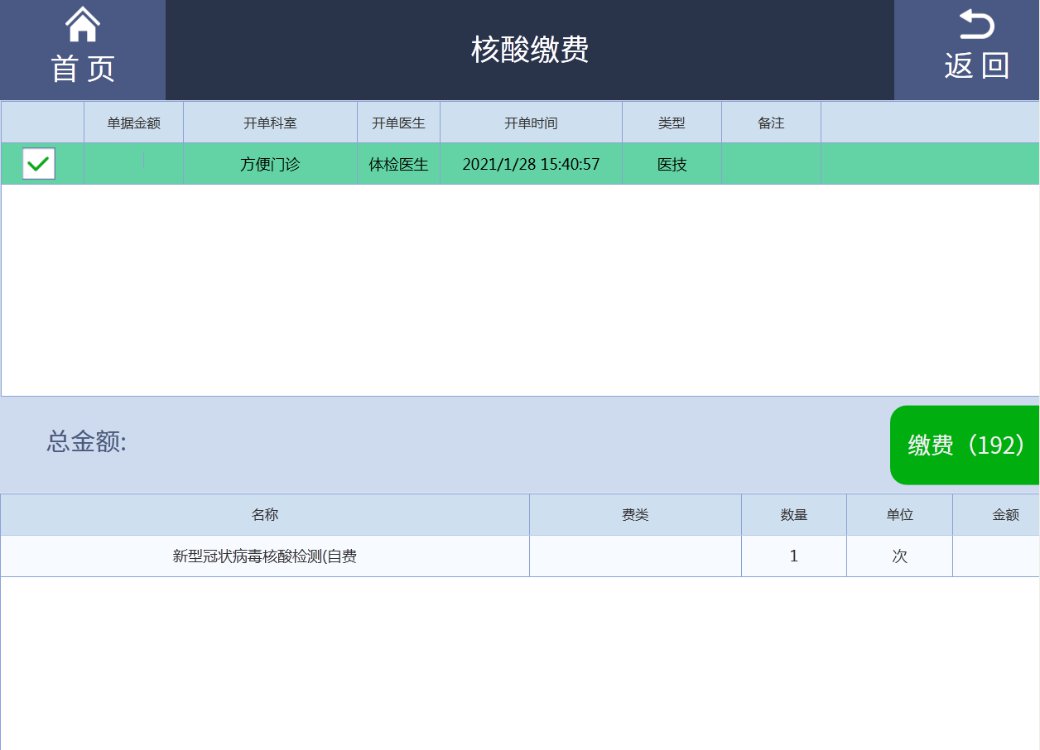 02、登陆后,在主页点击“核酸缴费”,再选择“核酸(咽拭子)”开单。
