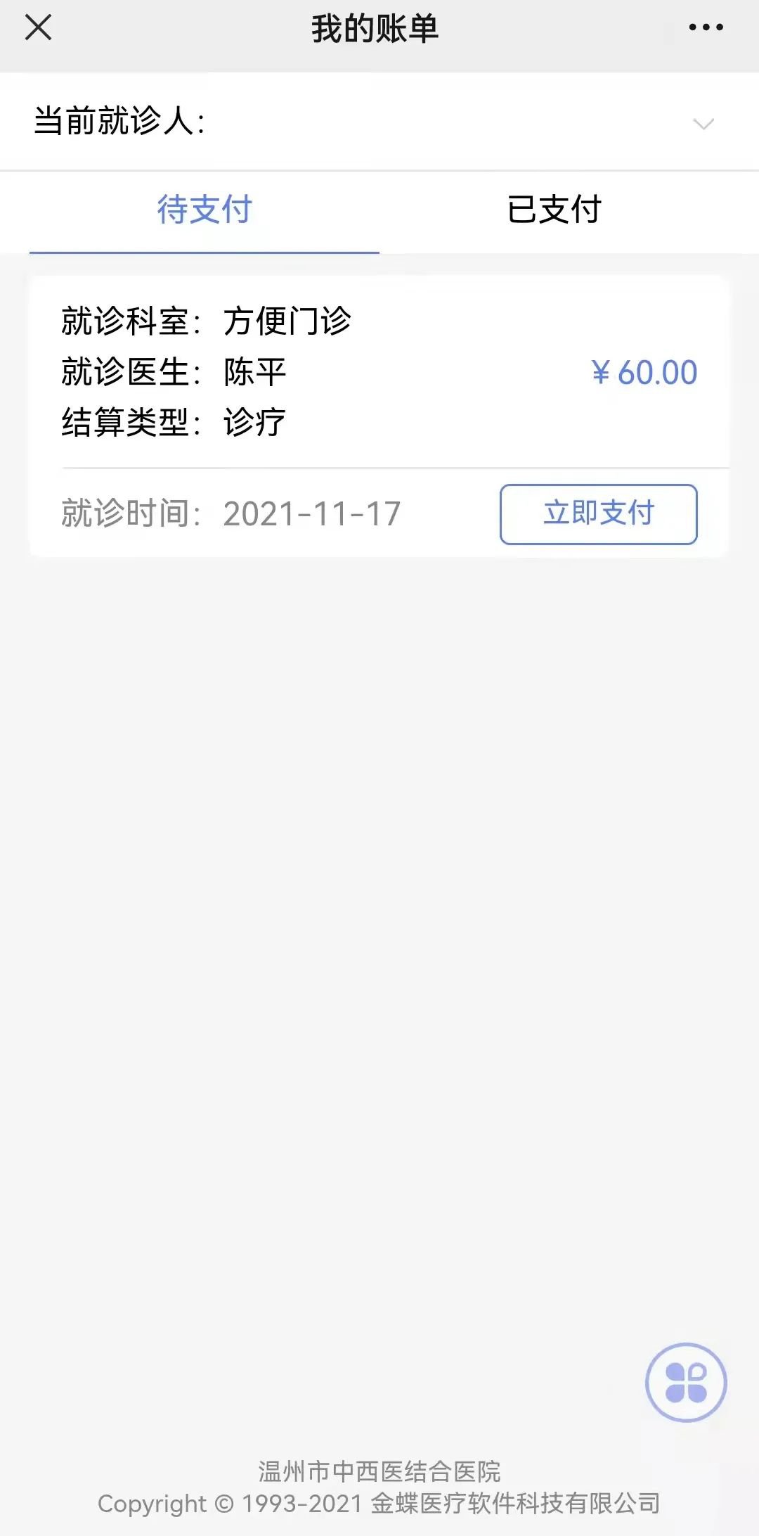 03、完成开单后,页面自动跳转到结算界面,请完成缴费结算。