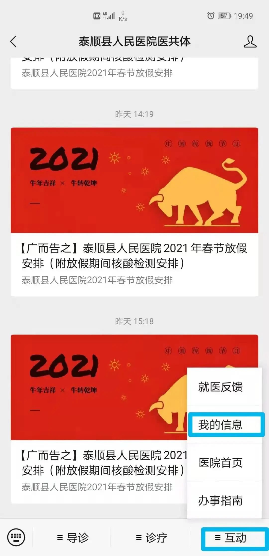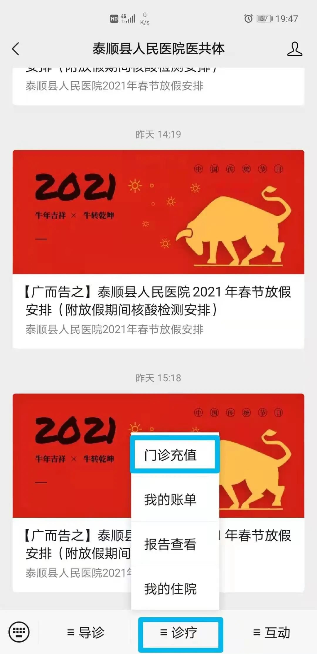方式一:关注“泰顺县人民医院医共体”微信公众号绑定就诊卡可以自助查询。