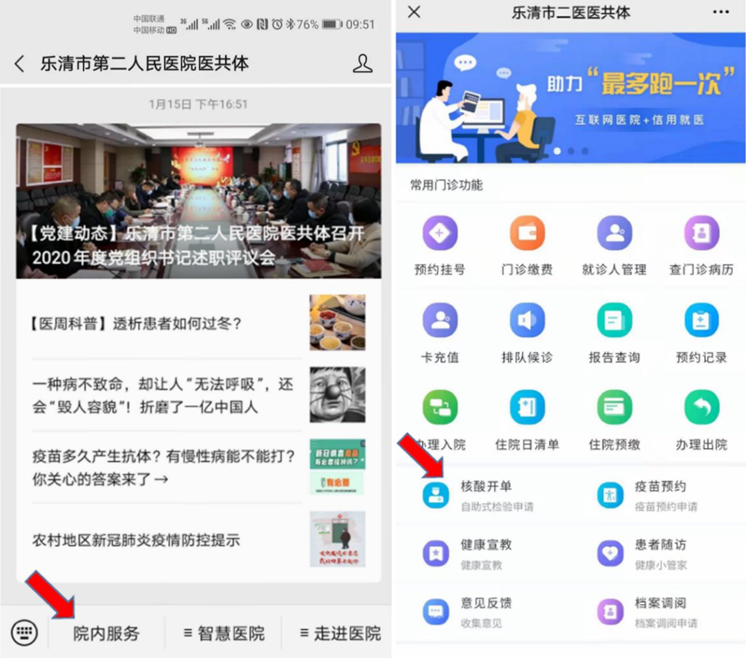 关注“乐清市第二人民医院医共体”微信公众号,点击“院内服务”,进入常用门诊功能/点击“核酸开单”。