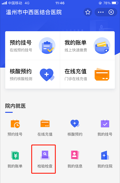 根据小票上的时间,打开医院官方小程序,点击“检验检查”查看检测报告。