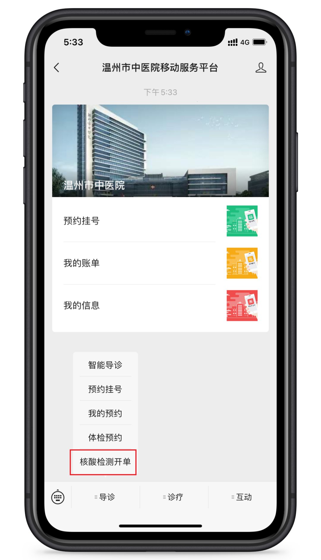 也可以通过“温州市中医院移动服务平台”公众号,完成手机预约核酸检测,并根据就诊指引前往对应科室做对应检验检查项目。